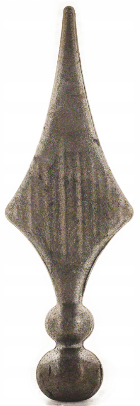 Grot stalowy kuty 13.118 o wymiarach 200x70 mm i podstawie fi 35 mm. Duże, ozdobne zakończenie do ogrodzeń, bram, furtek i krat, wykonane ze stali surowej, gotowe do montażu i dalszego wykończenia.