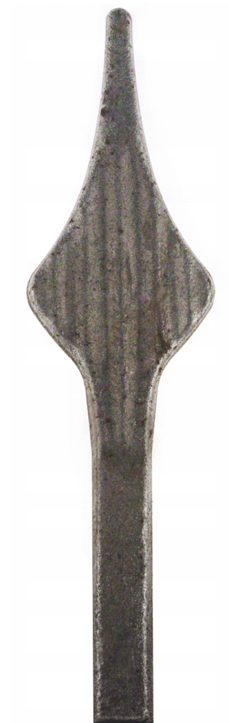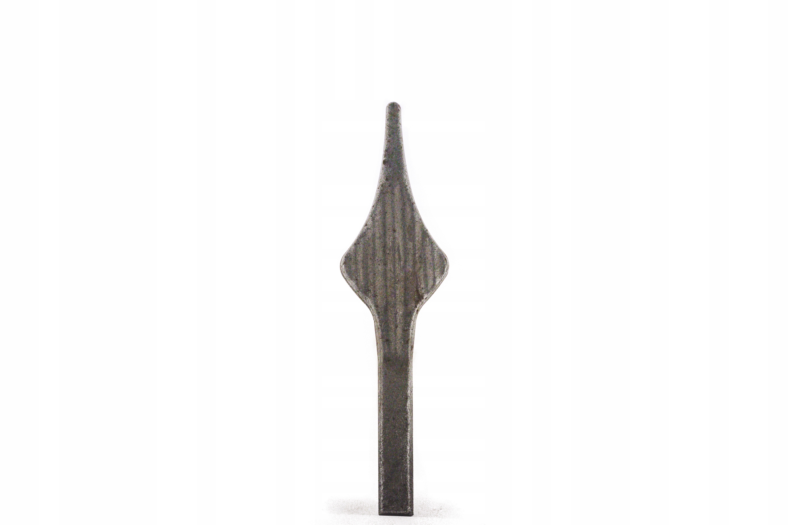 Grot włóczni 13.038 o wymiarach 190x50 mm i podstawie 16 mm. Dekoracyjne zakończenie do ogrodzeń, bram, furtek i krat, sprzedawane w stanie surowym, gotowe do montażu i dalszego zabezpieczenia powierzchni.