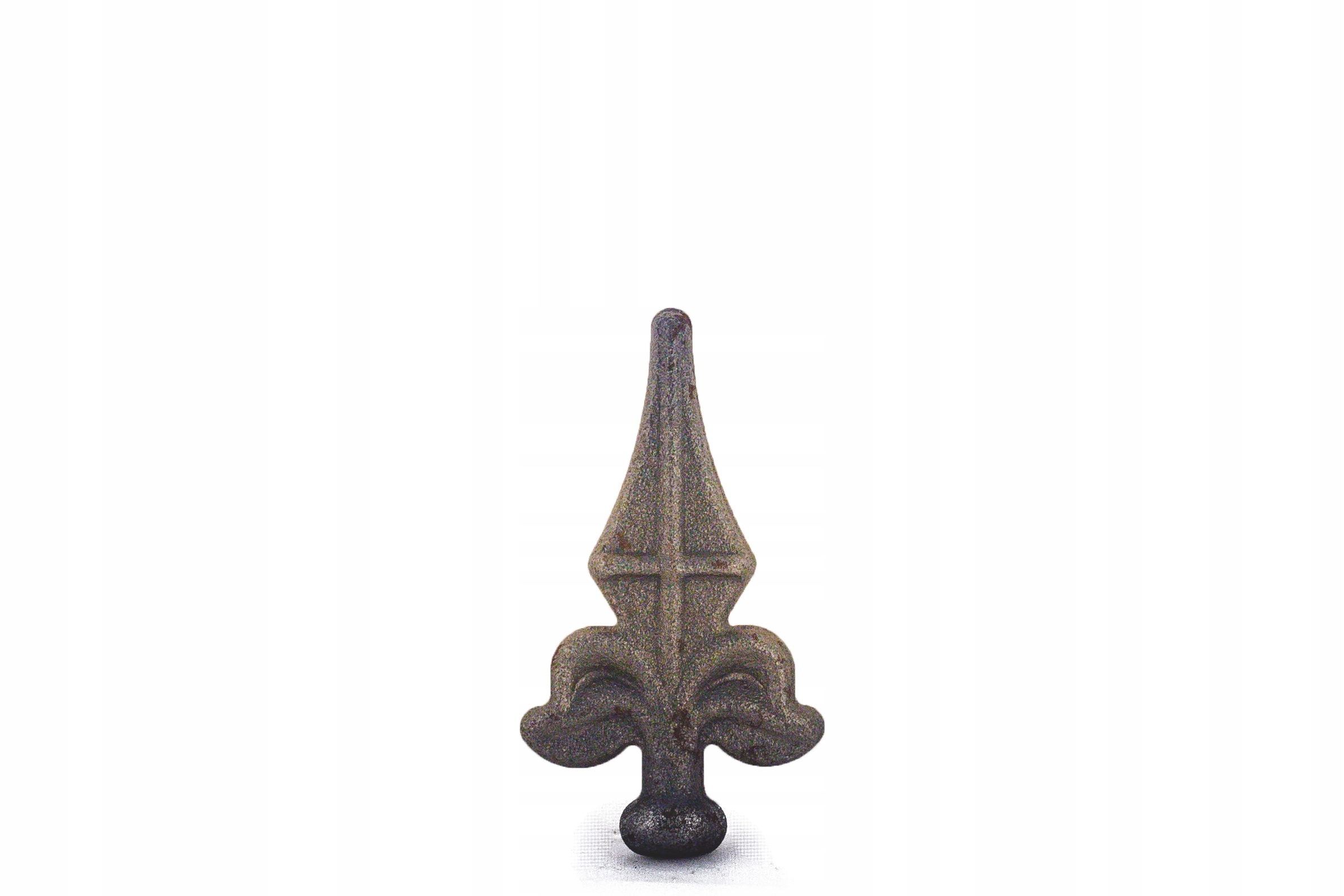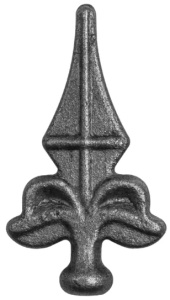 Grot stalowy kuty 13.060.01 o wymiarach 82x40 mm i podstawie fi 16 mm. Ozdobne zakończenie do ogrodzeń, bram, furtek i krat, wykonane ze stali surowej, gotowe do montażu i dalszego wykończenia.