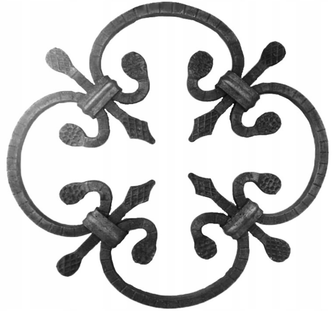 Rozeta ozdobna stalowa kuta 03.007 to dekoracyjny element przeznaczony do bram, ogrodzeń, balustrad oraz innych konstrukcji stalowych. Symetryczny wzór sprawia, że dobrze sprawdza się jako ozdobne wypełnienie przęsła lub detal uzupełniający projekt ślusarski.