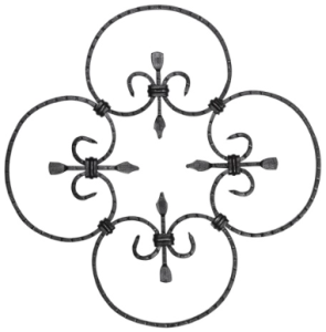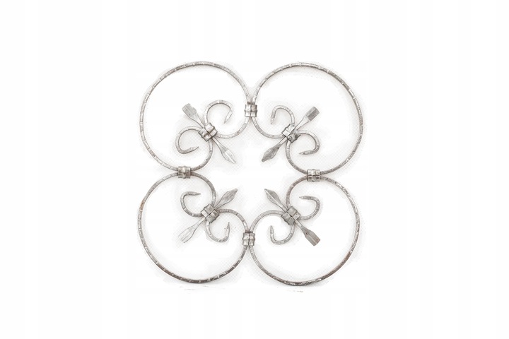 Rozeta ozdobna stalowa kuta 03.020 to dekoracyjny element przeznaczony do bram, ogrodzeń, balustrad oraz innych konstrukcji stalowych. Symetryczny układ wzoru sprawia, że dobrze prezentuje się jako centralne wypełnienie przęsła lub ozdobny akcent w projekcie ślusarskim.