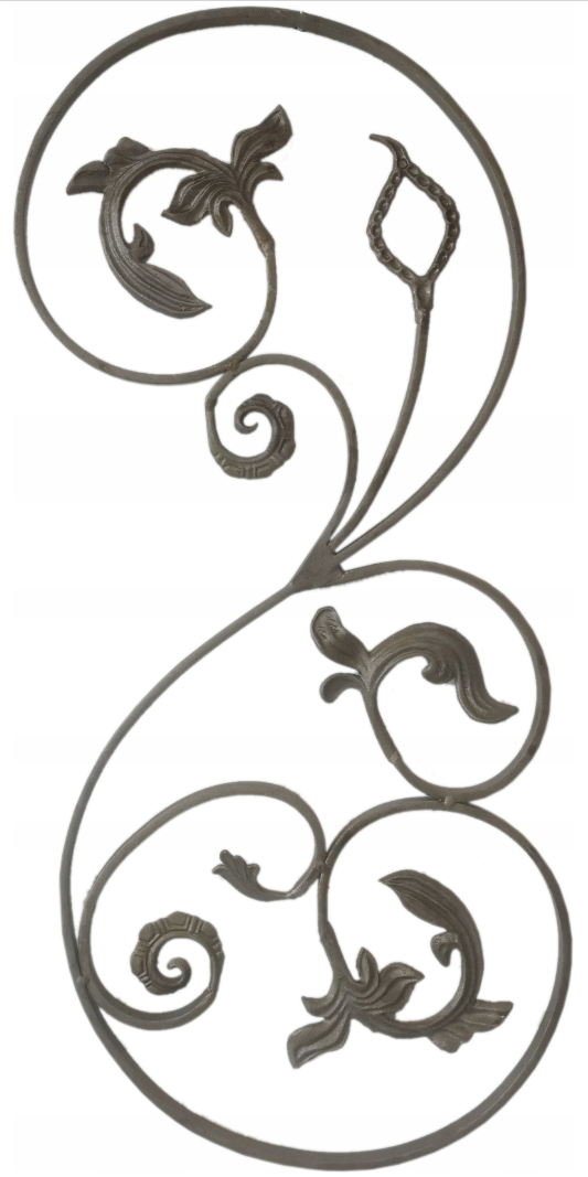 Rozeta ozdobna stalowa kuta MT-14 to dekoracyjny element przeznaczony do bram, ogrodzeń, balustrad oraz innych konstrukcji stalowych. Większy format 870x380 mm sprawia, że dobrze sprawdza się jako wyraziste wypełnienie przęsła lub ozdobny akcent w bardziej rozbudowanych projektach stalowych.