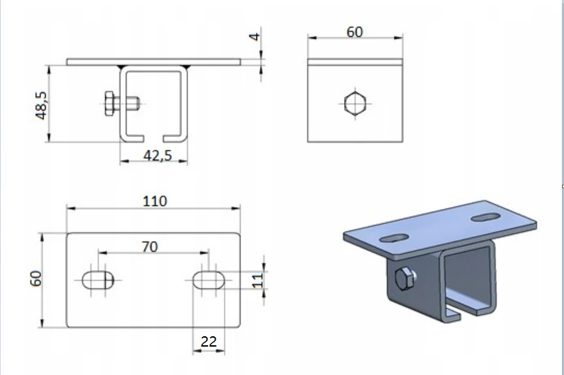 Konstrukcja została wykonana ze stali wysokogatunkowej i zabezpieczona srebrnym ocynkiem galwanicznym. Podłużne otwory montażowe umożliwiają korektę ustawienia, co pomaga wypoziomować szynę i dopasować jej położenie do konstrukcji nośnej.