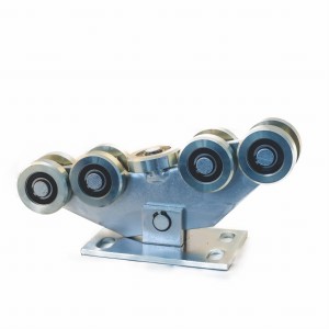 Wózek 9-rolkowy 60.008 do bram przesuwnych na profilu 80x80x5 mm. Model bez regulacji wysokości, wykonany ze stali ocynkowanej i wyposażony w łożyska 6204Z ERI-3.