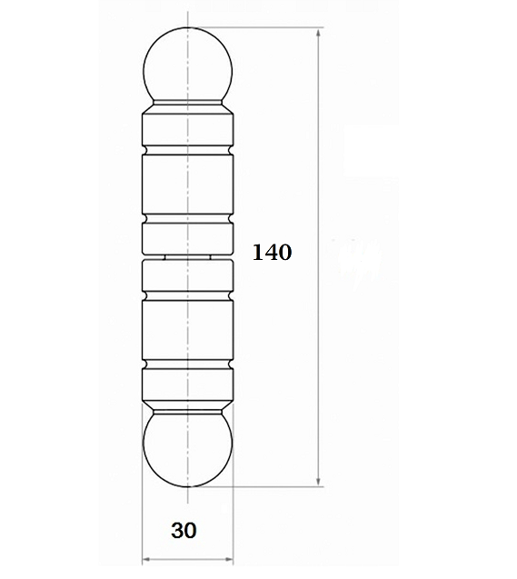 Ozdobny zawias toczony/kuty z kulką, fi 30 mm, o wysokości 140 mm. Przeznaczony do furtek, drzwi i bram skrzydłowych, z kulką zmniejszającą tarcie podczas pracy.